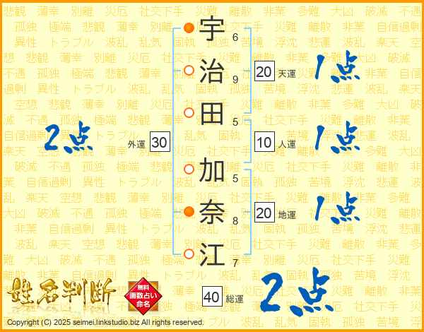 宇(6画)治(9画)田(5画) 加(5画)奈(8画)江(7画)