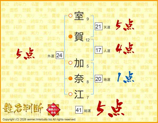 室(9画)賀(12画) 加(5画)奈(8画)江(7画)