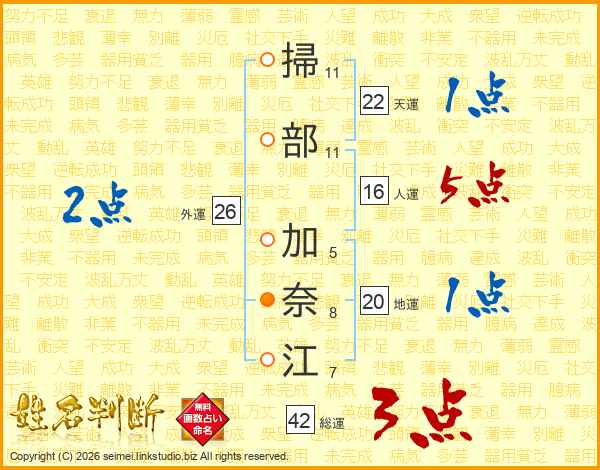 掃(11画)部(11画) 加(5画)奈(8画)江(7画)