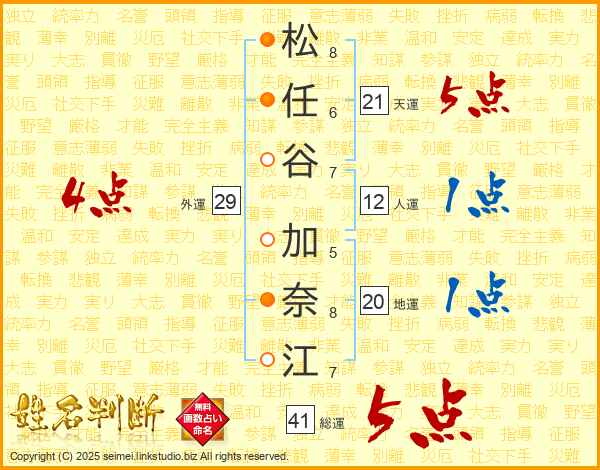 松(8画)任(6画)谷(7画) 加(5画)奈(8画)江(7画)