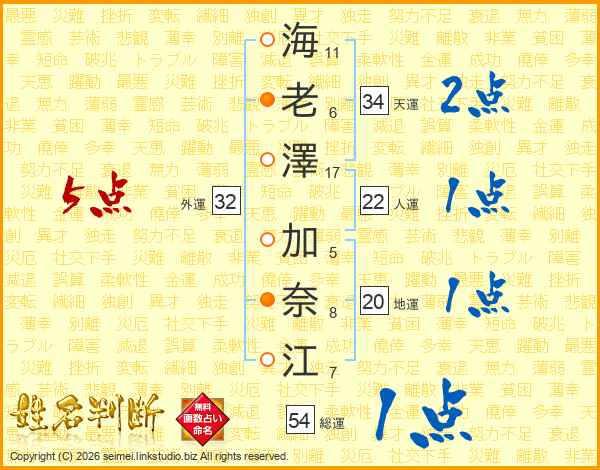 海(11画)老(6画)澤(17画) 加(5画)奈(8画)江(7画)