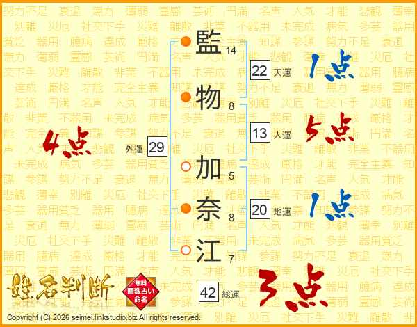監(14画)物(8画) 加(5画)奈(8画)江(7画)