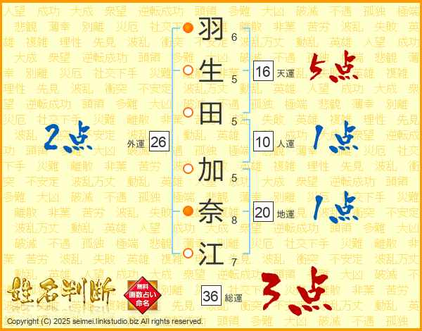 羽(6画)生(5画)田(5画) 加(5画)奈(8画)江(7画)