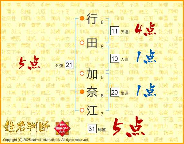 行(6画)田(5画) 加(5画)奈(8画)江(7画)