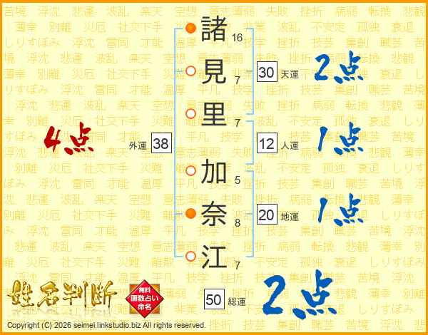 諸(16画)見(7画)里(7画) 加(5画)奈(8画)江(7画)