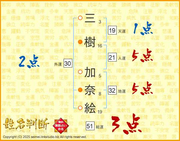 三(3画)樹(16画) 加(5画)奈(8画)絵(19画)