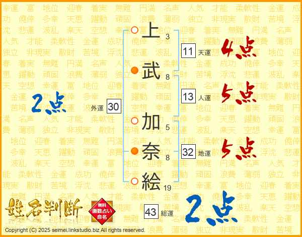 上(3画)武(8画) 加(5画)奈(8画)絵(19画)