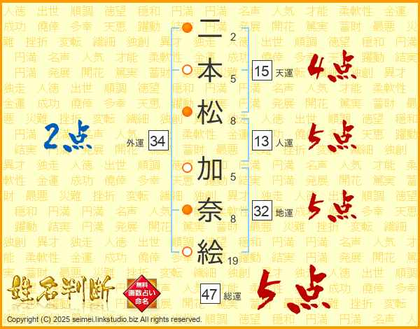 二(2画)本(5画)松(8画) 加(5画)奈(8画)絵(19画)