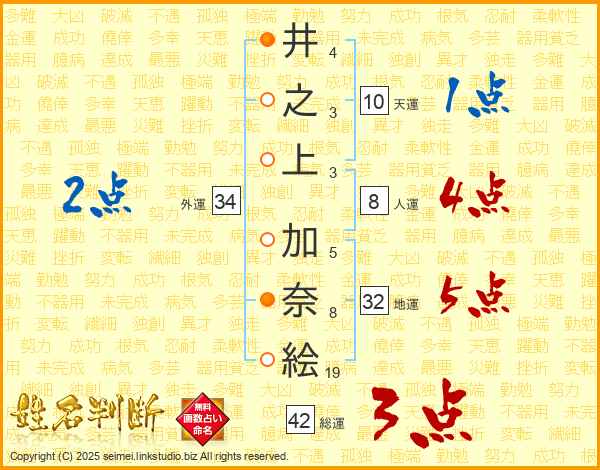 井(4画)之(3画)上(3画) 加(5画)奈(8画)絵(19画)