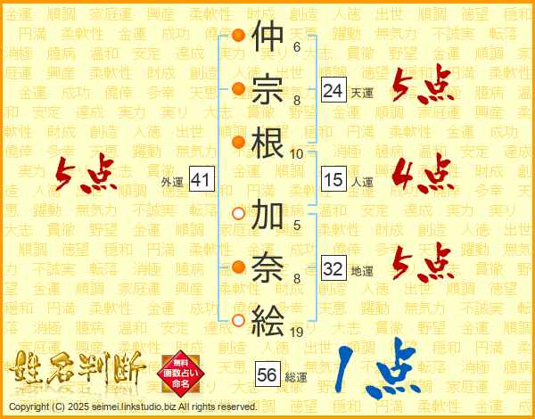 仲(6画)宗(8画)根(10画) 加(5画)奈(8画)絵(19画)