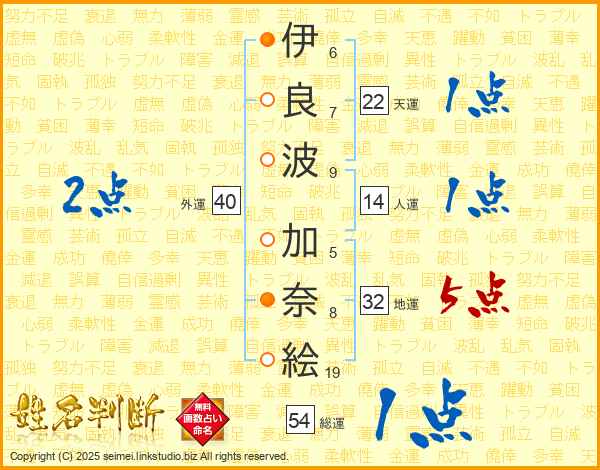 伊(6画)良(7画)波(9画) 加(5画)奈(8画)絵(19画)
