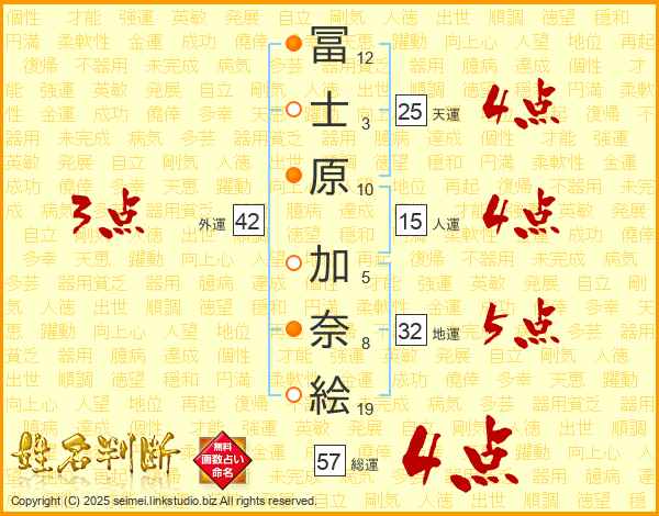 冨(12画)士(3画)原(10画) 加(5画)奈(8画)絵(19画)