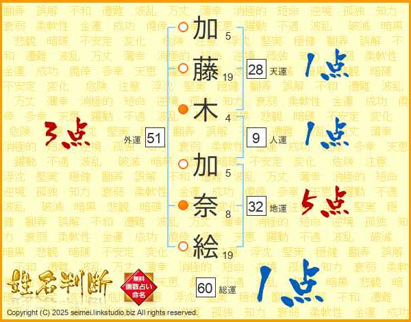 加(5画)藤(19画)木(4画) 加(5画)奈(8画)絵(19画)