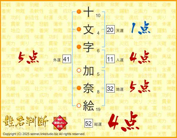 生活面を象徴する運勢です。外部から受ける影響力を表し、結婚運、家庭運や職場、環境への順応性を表します。総運から人運を引いた画数。姓や名が1文字の場合を除く。