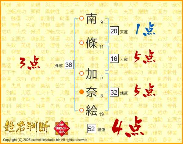 南(9画)條(11画) 加(5画)奈(8画)絵(19画)