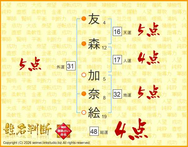 友(4画)森(12画) 加(5画)奈(8画)絵(19画)