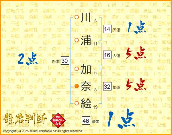 川(3画)浦(11画) 加(5画)奈(8画)絵(19画)