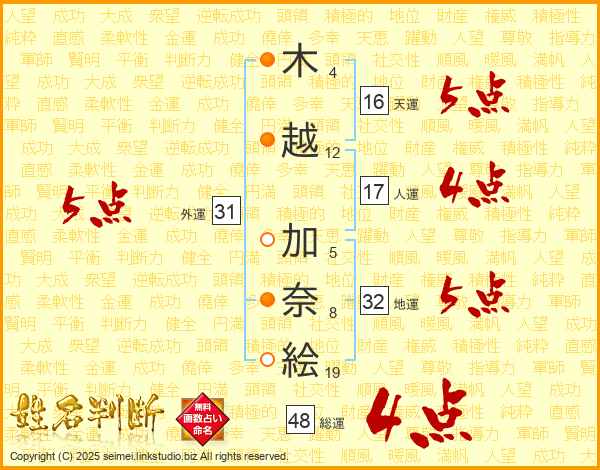 木(4画)越(12画) 加(5画)奈(8画)絵(19画)