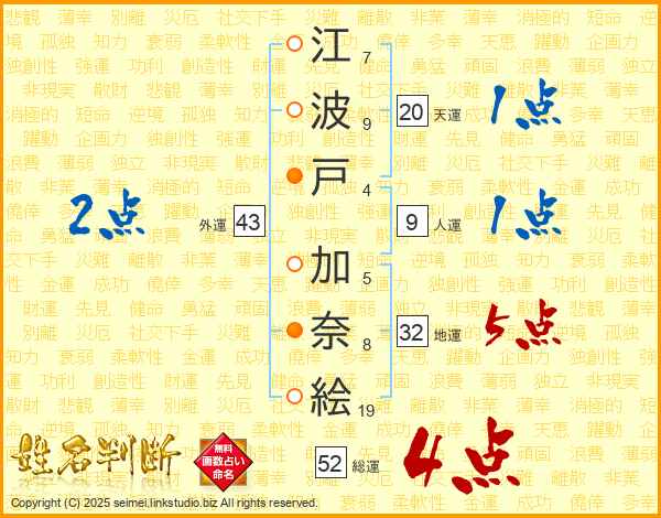 江(7画)波(9画)戸(4画) 加(5画)奈(8画)絵(19画)
