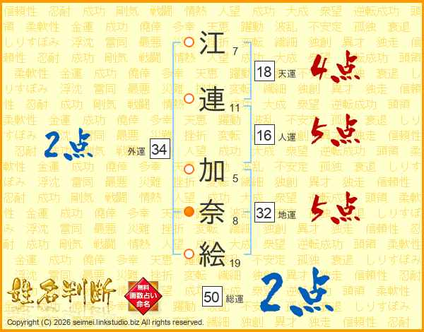 江(7画)連(11画) 加(5画)奈(8画)絵(19画)