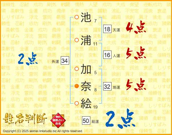 池(7画)浦(11画) 加(5画)奈(8画)絵(19画)