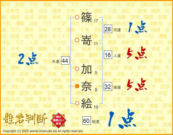 篠(17画)嵜(11画) 加(5画)奈(8画)絵(19画)