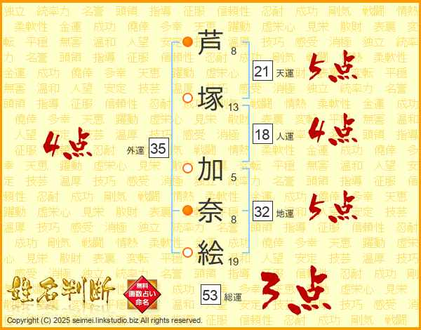 芦(8画)塚(13画) 加(5画)奈(8画)絵(19画)