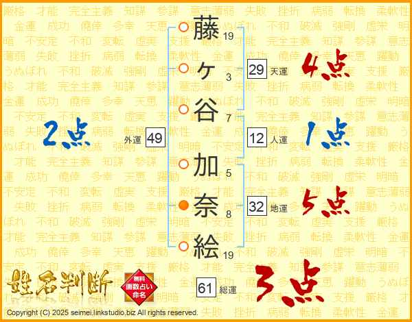 藤(19画)ヶ(3画)谷(7画) 加(5画)奈(8画)絵(19画)