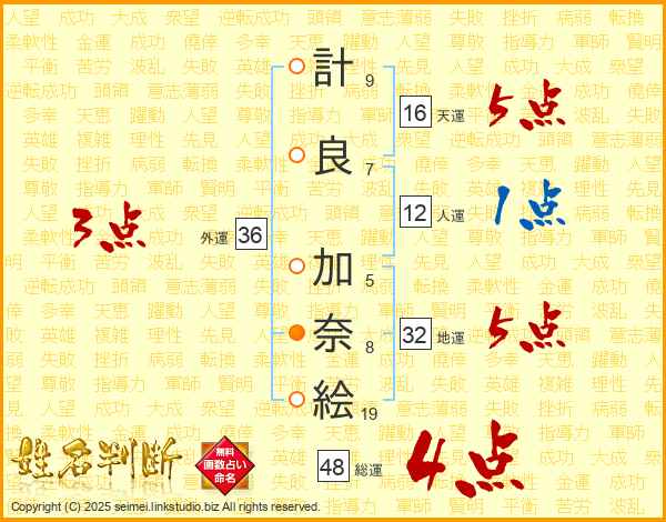 計(9画)良(7画) 加(5画)奈(8画)絵(19画)