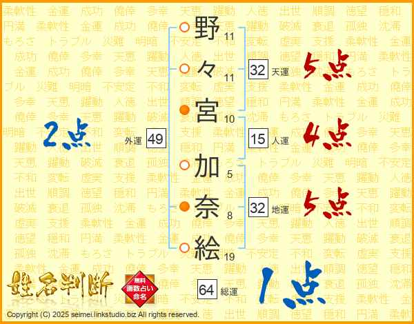 野(11画)々(11画)宮(10画) 加(5画)奈(8画)絵(19画)