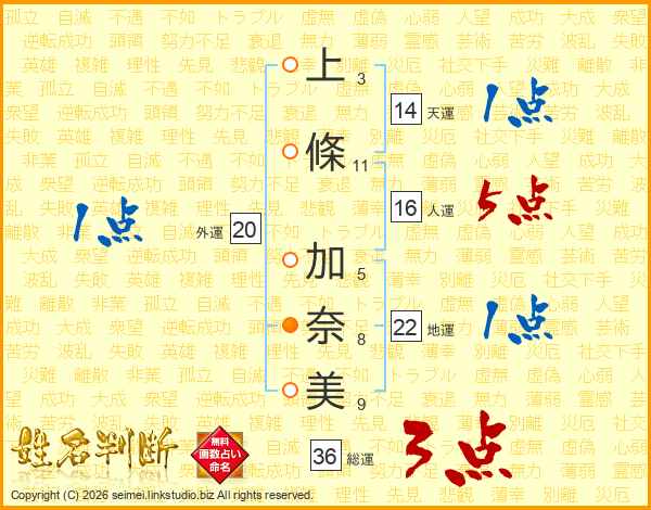 上(3画)條(11画) 加(5画)奈(8画)美(9画)