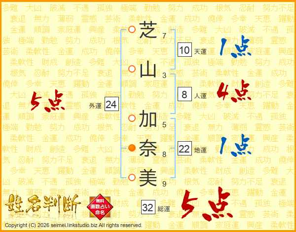 芝山加奈美さんの総運は32画の5点!