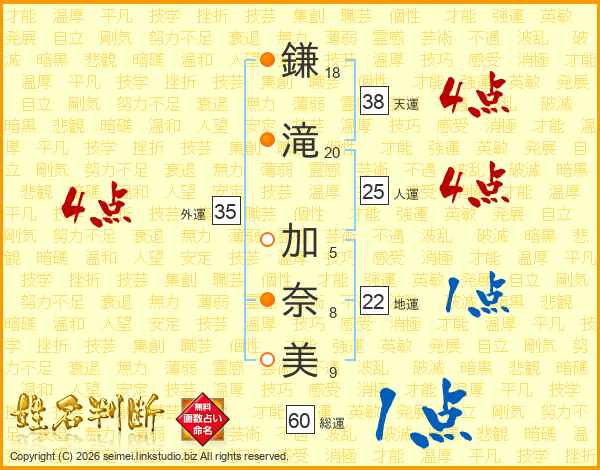鎌(18画)滝(20画) 加(5画)奈(8画)美(9画)