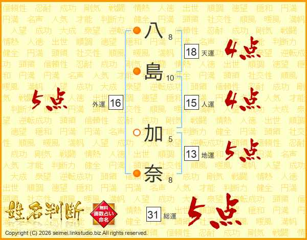 生活面を象徴する運勢です。外部から受ける影響力を表し、結婚運、家庭運や職場、環境への順応性を表します。総運から人運を引いた画数。姓や名が1文字の場合を除く。