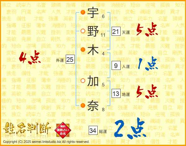 宇(6画)野(11画)木(4画) 加(5画)奈(8画)