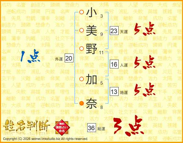 小(3画)美(9画)野(11画) 加(5画)奈(8画)