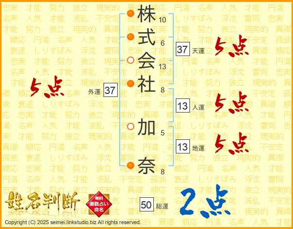 株(10画)式(6画)会(13画)社(8画) 加(5画)奈(8画)