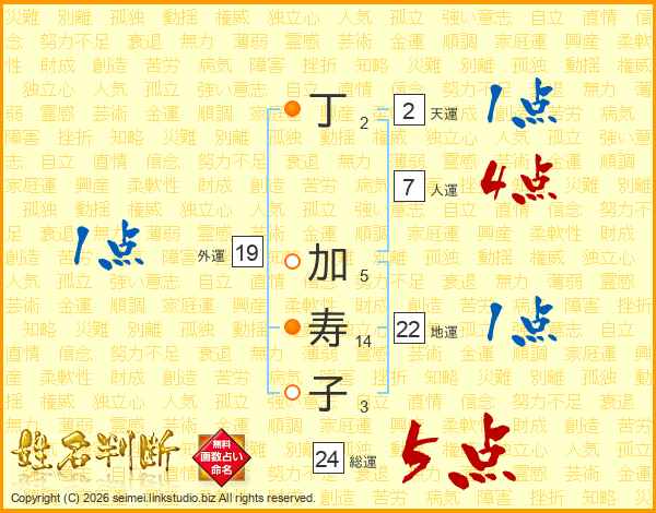 生活面を象徴する運勢です。外部から受ける影響力を表し、結婚運、家庭運や職場、環境への順応性を表します。総運から人運を引いた画数。姓や名が1文字の場合を除く。