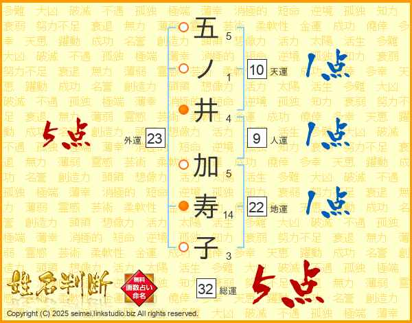 五(5画)ノ(1画)井(4画) 加(5画)寿(14画)子(3画)