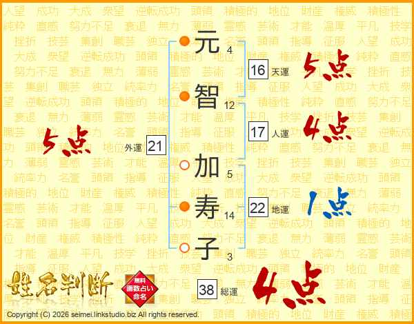 元(4画)智(12画) 加(5画)寿(14画)子(3画)