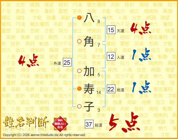 八角加寿子さんの総運は37画の5点!