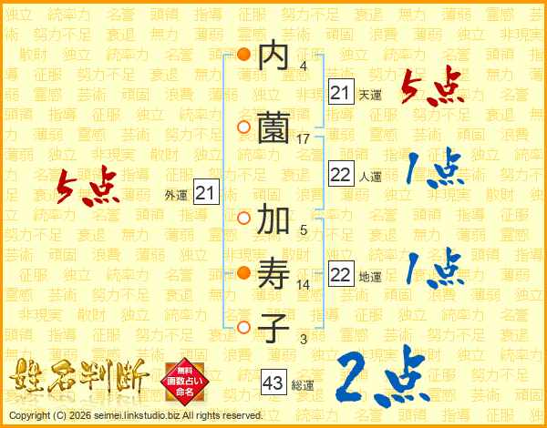 内(4画)薗(17画) 加(5画)寿(14画)子(3画)