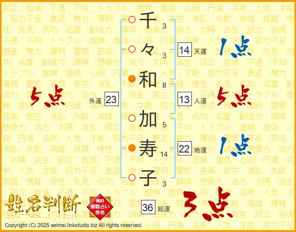 千(3画)々(3画)和(8画) 加(5画)寿(14画)子(3画)
