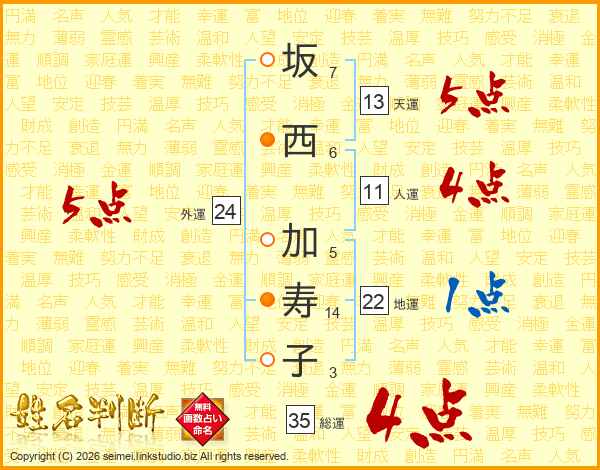 坂(7画)西(6画) 加(5画)寿(14画)子(3画)