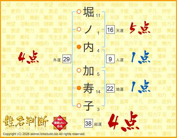 堀ノ内加寿子さんの総運は38画の4点!