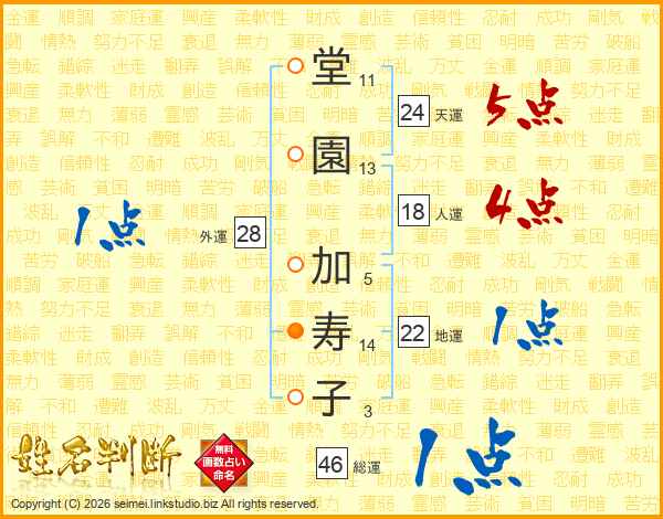 堂(11画)園(13画) 加(5画)寿(14画)子(3画)