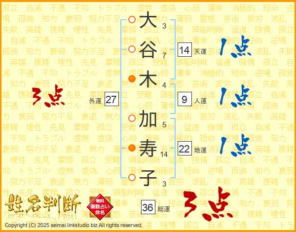 大(3画)谷(7画)木(4画) 加(5画)寿(14画)子(3画)