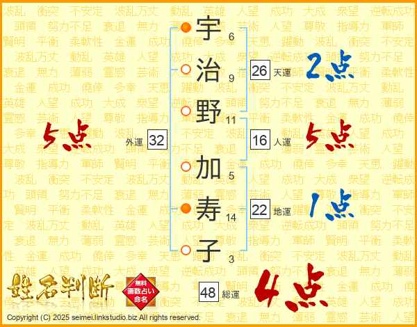 宇(6画)治(9画)野(11画) 加(5画)寿(14画)子(3画)