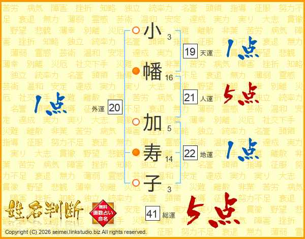 小(3画)幡(16画) 加(5画)寿(14画)子(3画)