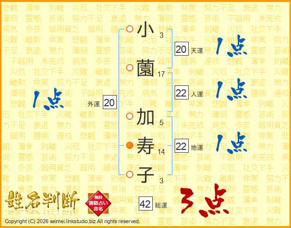小(3画)薗(17画) 加(5画)寿(14画)子(3画)